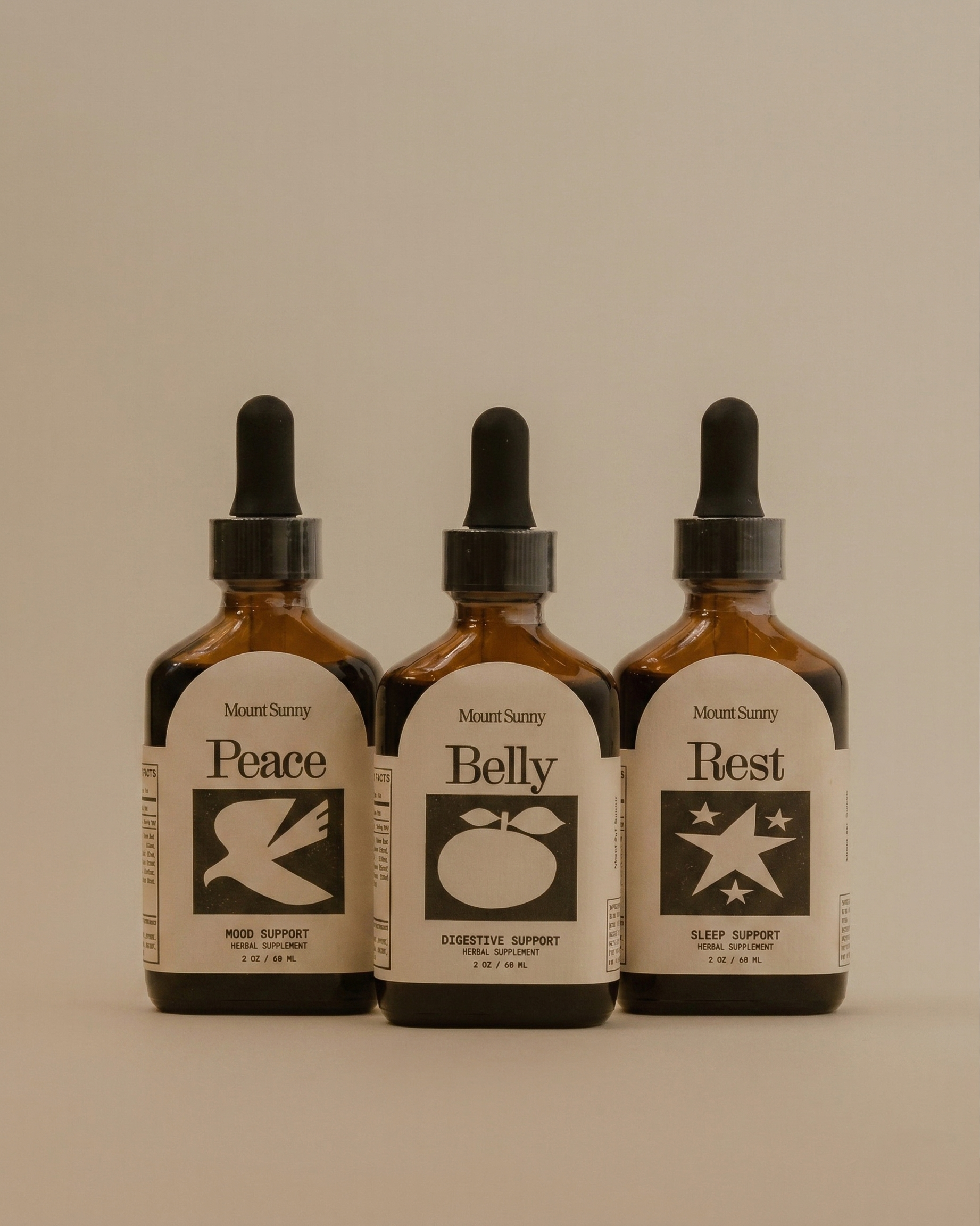 The Starter Ritual bundles our three bestselling tinctures—Peace, Rest, and Belly—for the stress–sleep–digestion trio we see together most in the clinic. Peace is for when you're anxious, stressed, or overwhelmed and want a little room to breathe. Rest supports a deeper, more restful night when sleep won't stick. Belly supports digestive ease; the herbs are bitter, so taking it before meals helps your body start digestion instead of chasing symptoms afterward. Easy to take straight from the dropper or mixed into a drink. Use as directed.